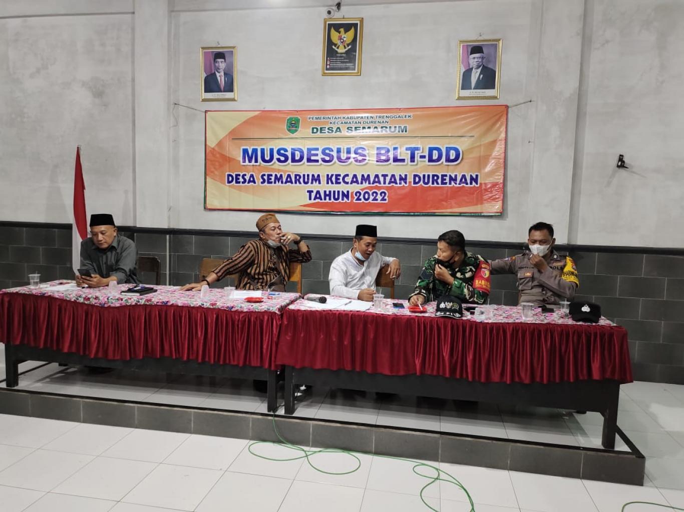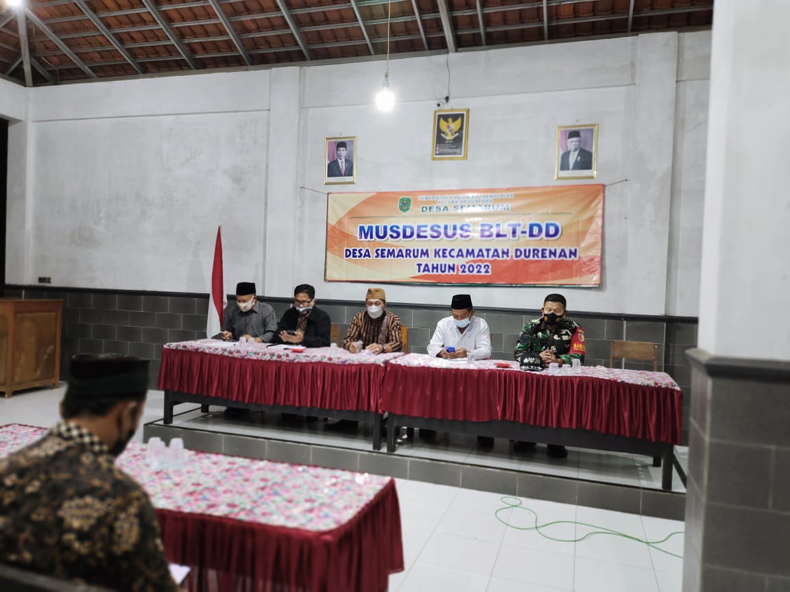 pada tanggal 18 januari 2022 bertempat di balai desa semarum,pemerintah desa semarum telah menyelenggarakan MUSDESUS BLT-DD yang di pimpin oleh Bapak Mujari,spd Selaku Ketua BPD Desa Semarum,dengan menyelenggarakan musyawarah desa terkait penerima manfaat bantuan langsung tunai,dan sekaligus penetapan penerima manfaat BLT-DD tahun 2022 di Desa Semarum, dari masing-masing kepala dusun menyerahkan beberapa usulan nama-nama KPM BLT-DD,yang sudah di usulkan oleh RT/RW,Tomas,Toga,BPD dan tokoh masyarakat lainnya sesuai dengan kriteria penerima bantuan tersebut.